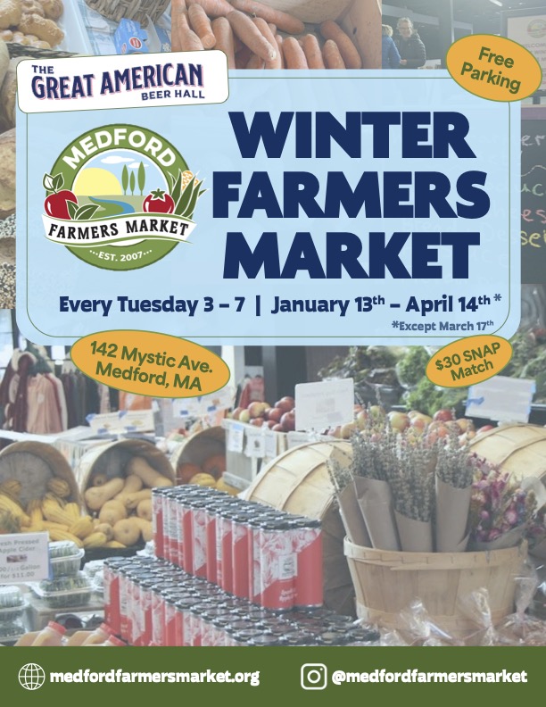 Medford Winter Farmer's Market, February 3rd, 3-7pm, Great American Beer Hall, 142 Mystic Ave, Medford, MA